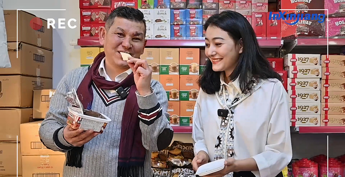 2024年1月26日,《InXinjiang》栏目记者古丽尼尕尔·艾麦提(右一)专访土耳其糖果商Ozturk Ferhat。