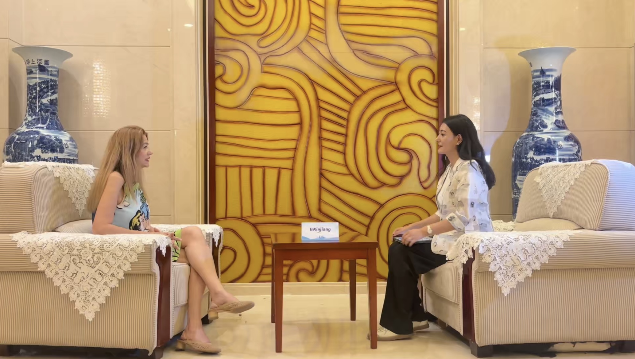 意大利国家广播电视台“GeoParlamento”广播节目编辑、主持人达涅拉·比内洛(左)就新疆经济社会发展等相关话题接受《InXinjiang》栏目专访