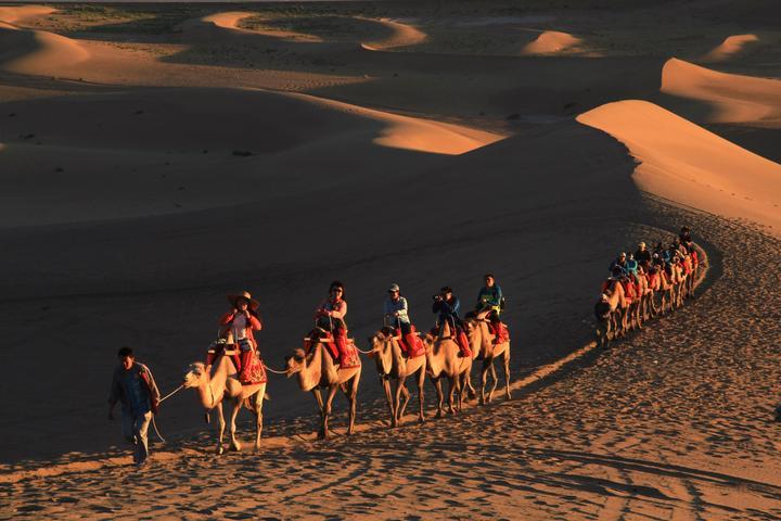 游客在甘肃省敦煌市鸣沙山月牙泉景区游览。张晓亮摄
