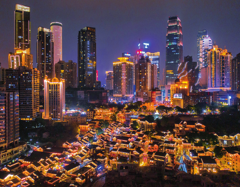 重庆市渝中区十八梯传统风貌区和远处高楼林立的解放碑CBD夜景(2023年2月10日摄)。黄伟摄/本刊