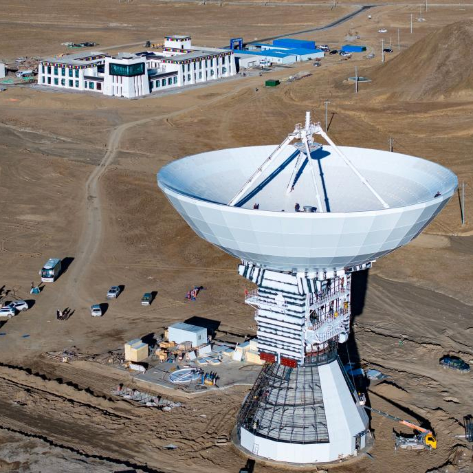 建设中的西藏日喀则40米射电望远镜(2024年11月7日摄,无人机照片。)。在日喀则,40米口径射电望远镜已于2024年10月完成天线系统主反射体的吊装,预计将于年底完成基本建设,2025年年初具备观测能力。建成后,它将和上海、吉林、新疆、云南等地的射电望远镜站点,以及上海VLBI数据处理中心共同构成“六站一中心”的中国甚长基线干涉测量网。新华社记者 姜帆 摄