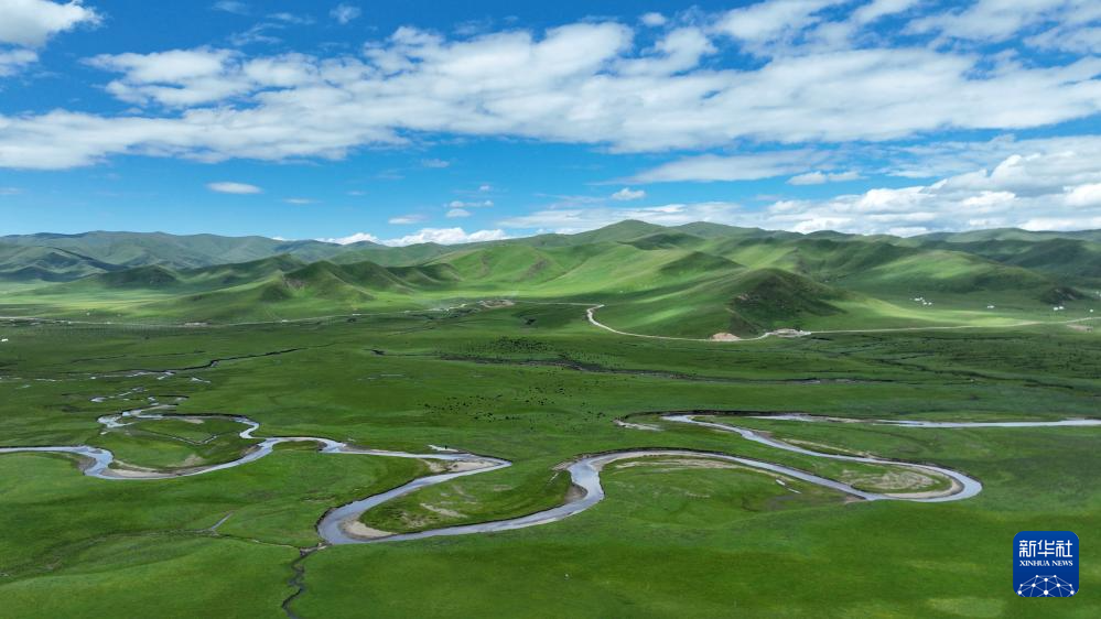 这是2023年7月6日在甘肃省甘南藏族自治州玛曲县拍摄的阿万仓湿地景色(无人机照片)。新华社记者 陈斌 摄