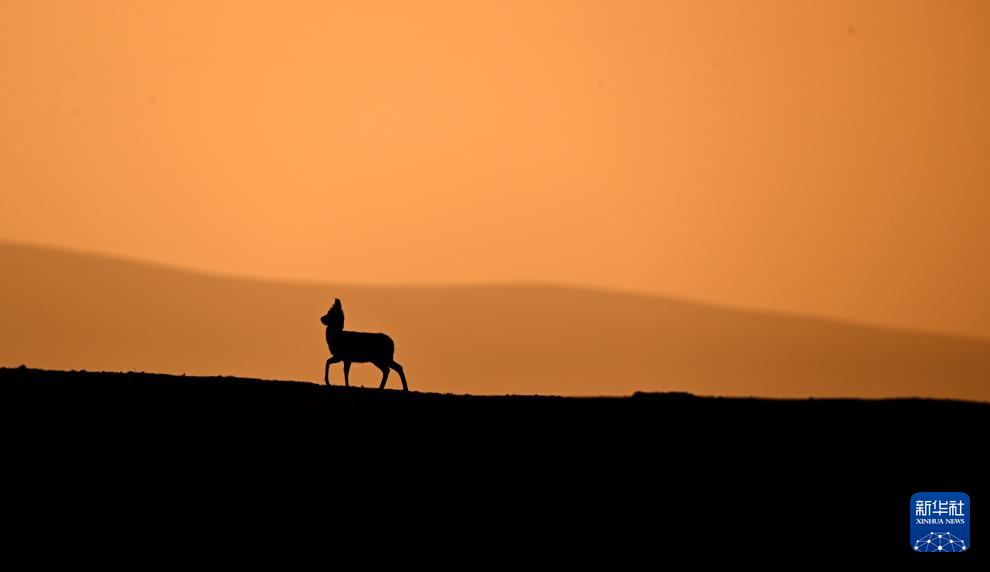 一只藏羚羊在三江源国家公园长江源区可可西里卓乃湖区域活动(2023年6月18日摄)。新华社记者 张宏祥 摄