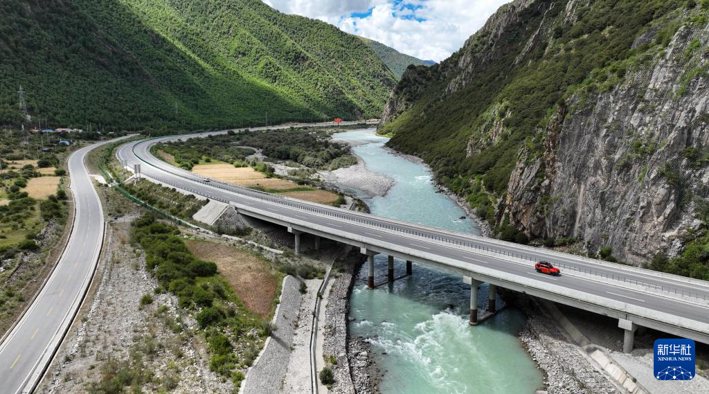 2024年9月3日拍摄的西藏林芝至拉萨高等级(高速)公路及仍在使用中的老路(左)(无人机照片)。新华社记者 晋美多吉 摄