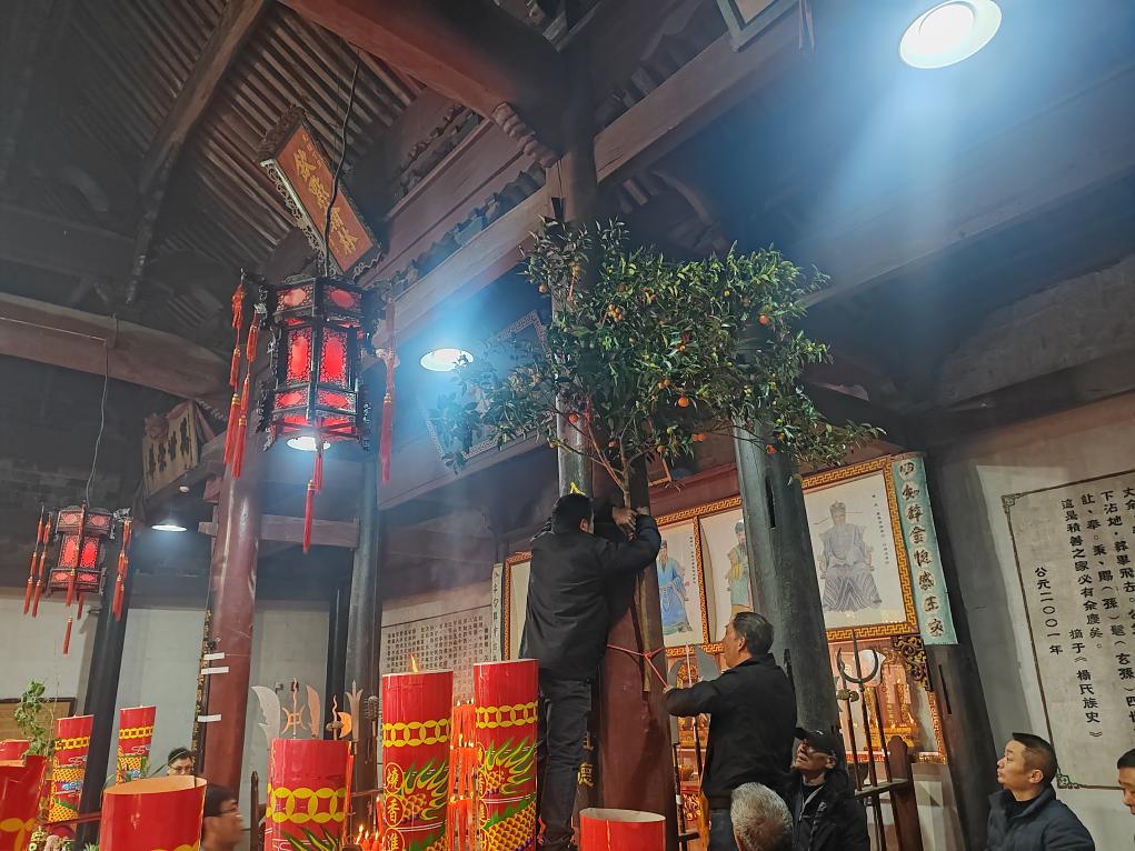 村民把小橘树绑在家庙的柱子上。新华社记者 冯源 摄
