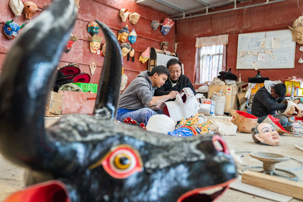 ↑拉萨布制面具制作技艺西藏自治区级非遗传承人西洛(中)和同事交流西藏传统面具制作心得。