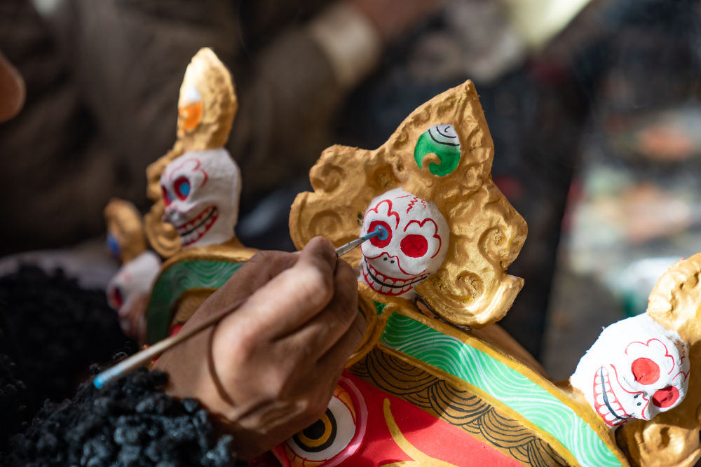 ↑拉萨达孜区雪乡民间传统手工艺农民专业合作社的面具制作工匠制作传统面具。