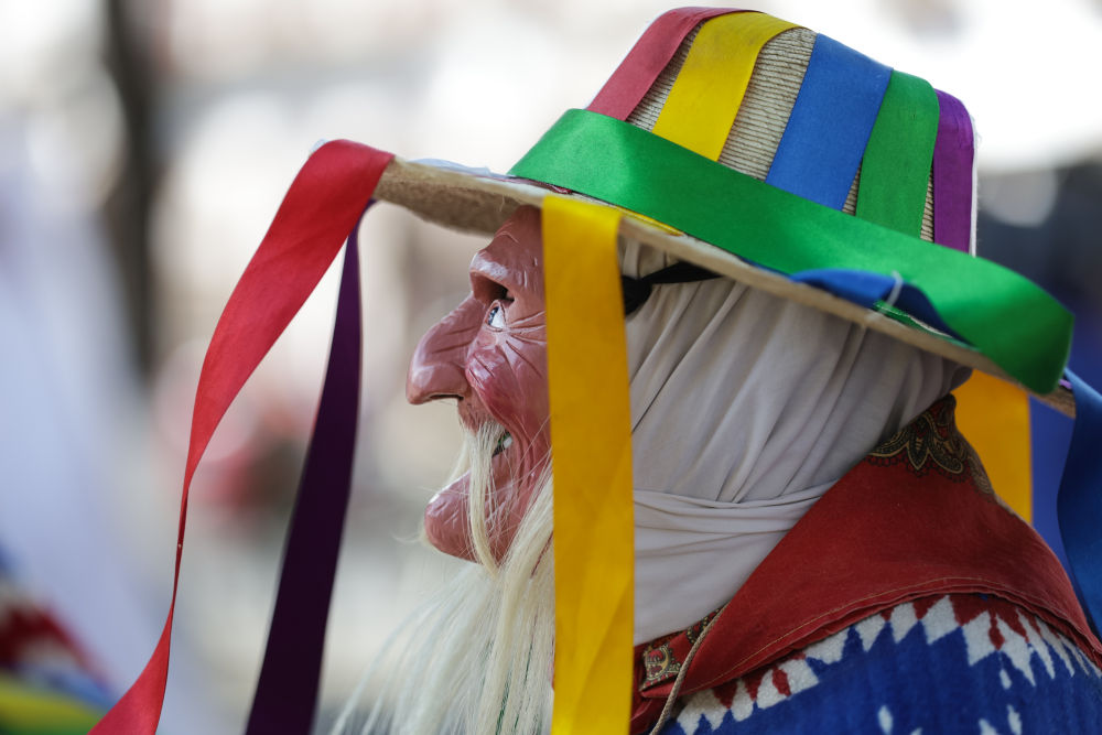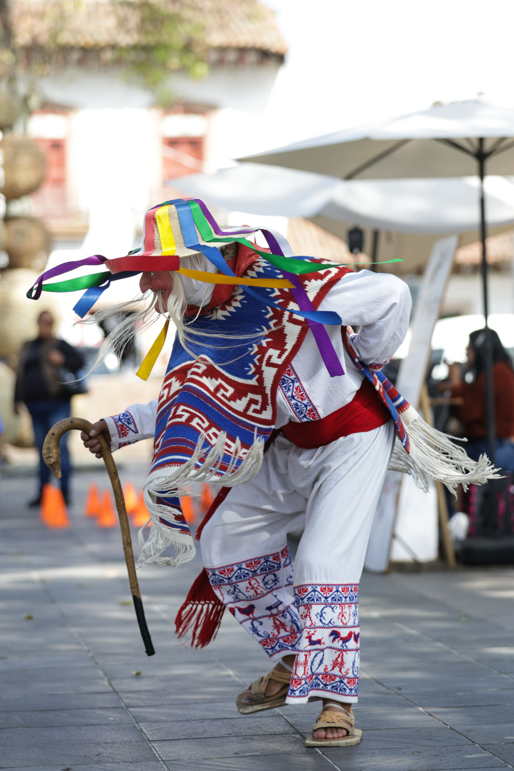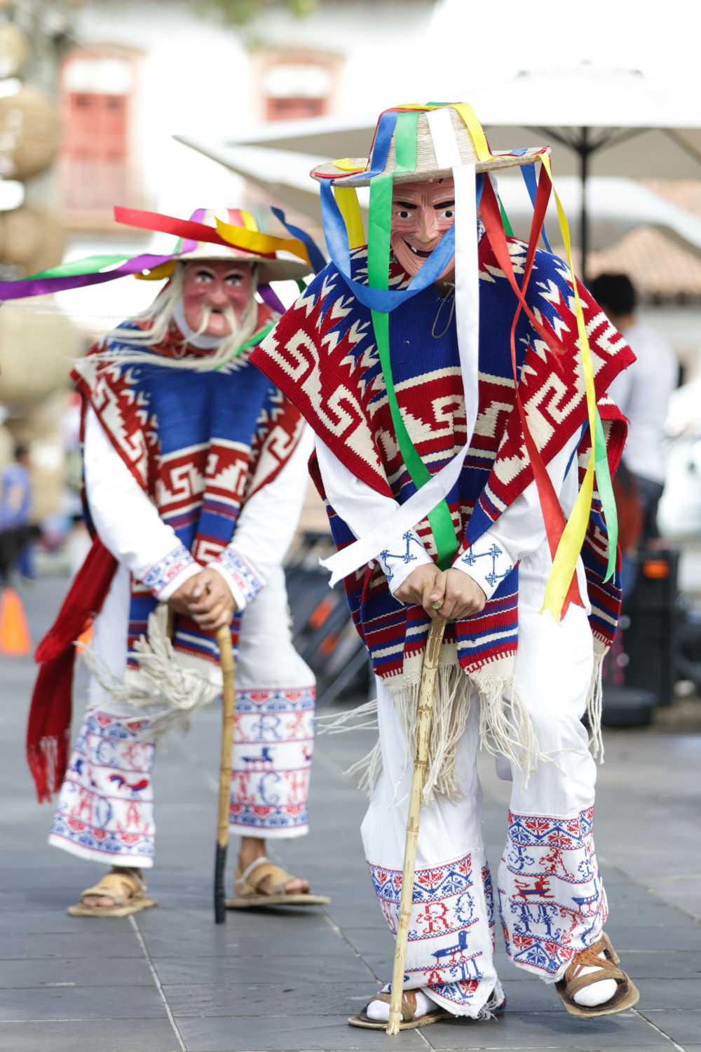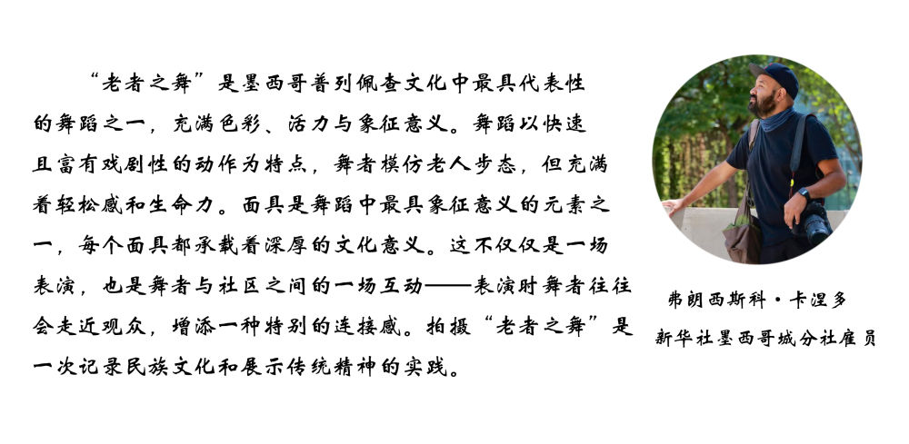 面具制作在墨西哥也有着悠久的历史,有各式各样的面具用于各种舞蹈和庆典。舞者表演“老者之舞”时往往配戴着略显夸张的面具,面具通常带有皱纹、胡须和微笑的表情,借以塑造一种看似滑稽、幽默却充满智慧的形象。除了老人面具,舞者表演时还会穿着传统的普列佩查民族服饰,包括刺绣彩色披肩、白色农民风格的长衫和编织草帽,整体造型鲜艳、喜庆。舞蹈表演时舞者会模仿老人的步态,以滑稽的方式弯腰驼背,手持拐杖或木棍,摇摇晃晃地迈步,同时做出灵活的跳跃和旋转动作,展现一种出人意料的活力与生命力。