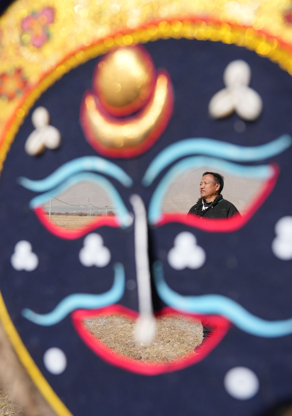 ↑拉萨布制面具制作技艺西藏自治区级非遗传承人西洛在合作社门前的空地上和同事一起检查做好的西藏传统面具。