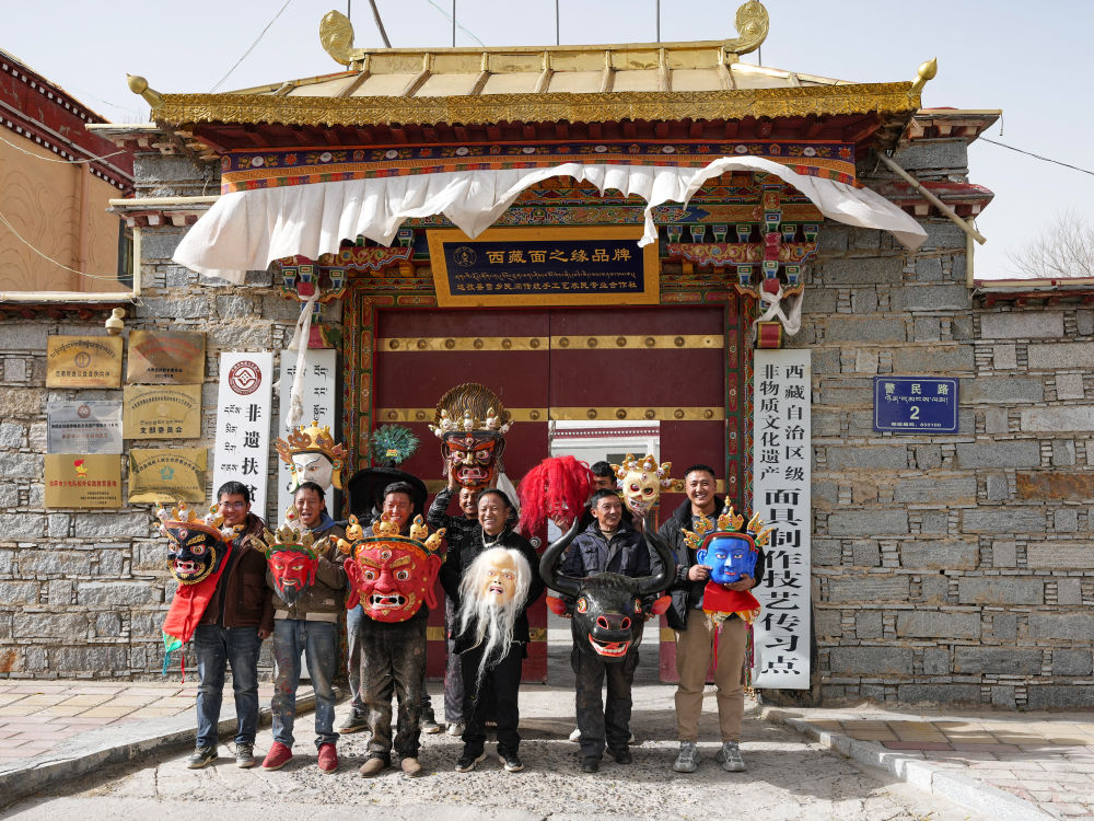 ↑拉萨达孜区雪乡民间传统手工艺农民专业合作社的面具制作工匠们在合作社门口合影。