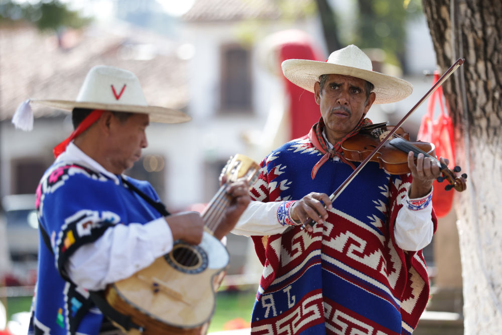 ↑一名舞者在墨西哥米却肯州的帕茨夸罗,艺术家演奏小提琴和吉他为“老者之舞”表演伴奏。