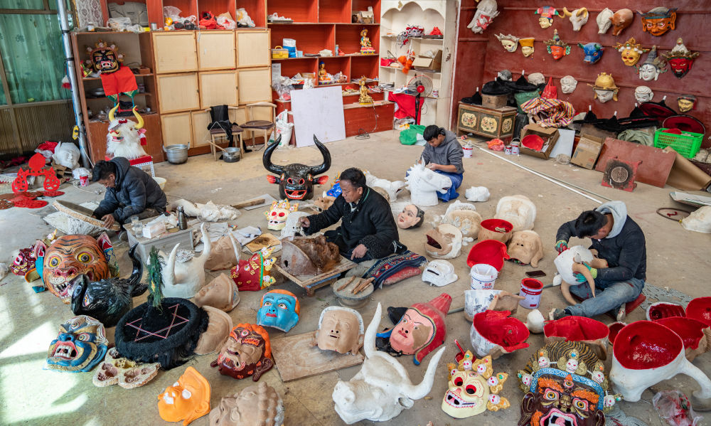 ↑拉萨布制面具制作技艺西藏自治区级非遗传承人西洛(中)和同事一同制作西藏传统面具。