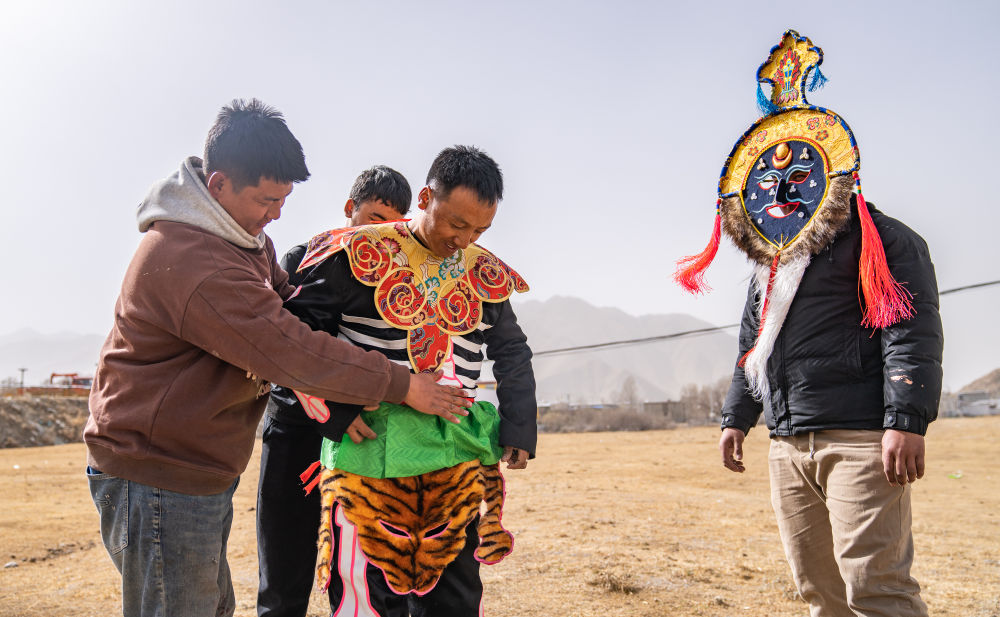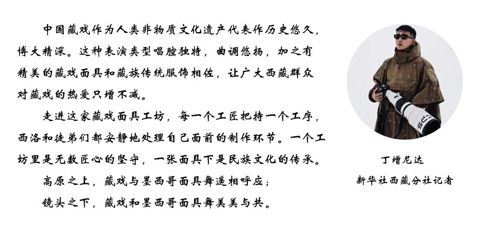 ↑拉萨达孜区雪乡民间传统手工艺农民专业合作社的工匠在合作社门前的空地上佩戴检查做好的西藏传统面具。
