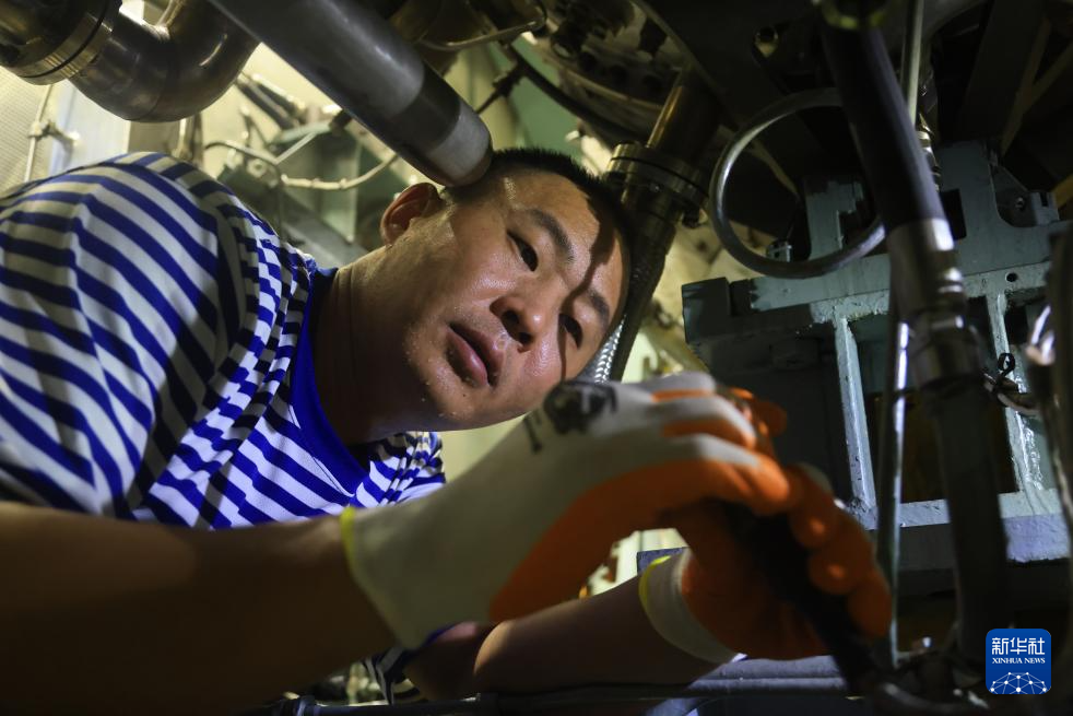 海军导弹驱逐舰海口舰技师周帅在舰艇停航期间进行装备检修(2024年7月5日摄)。新华社发(黄嘉诚 摄)