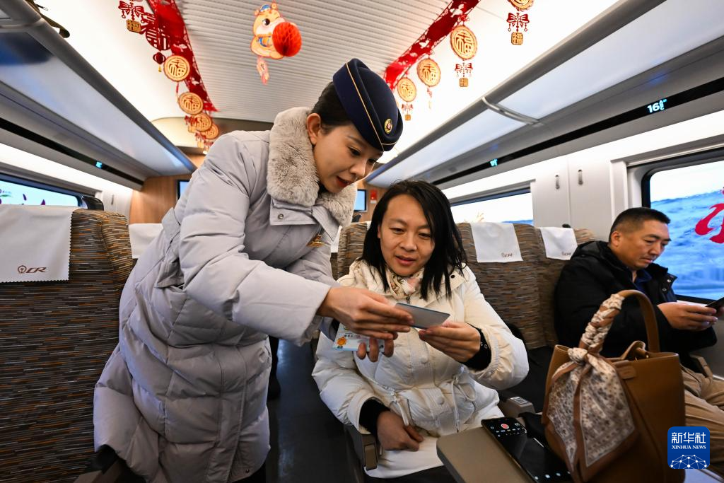 12月31日,在呼和浩特东站开往太原南站的G4798次列车上,列车员为乘客介绍首发纪念卡片。 新华社记者 李志鹏 摄