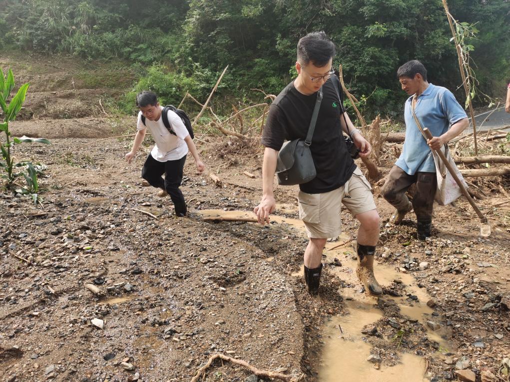 2024年6月21日,记者杜宇(中)、潘峰(左)与村民程海生一起徒步翻越滑坡点。