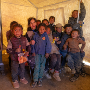 12日上午,西藏定日县曲洛乡措昂村的集中安置点里,一群小姑娘围着一名大姐姐,欢呼雀跃。她们从大姐姐的手里接过颜料笔、画纸、糖果等礼物,咧嘴笑了起来。