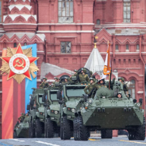 2024年5月9日,在俄罗斯首都莫斯科,军车编队驶过红场。