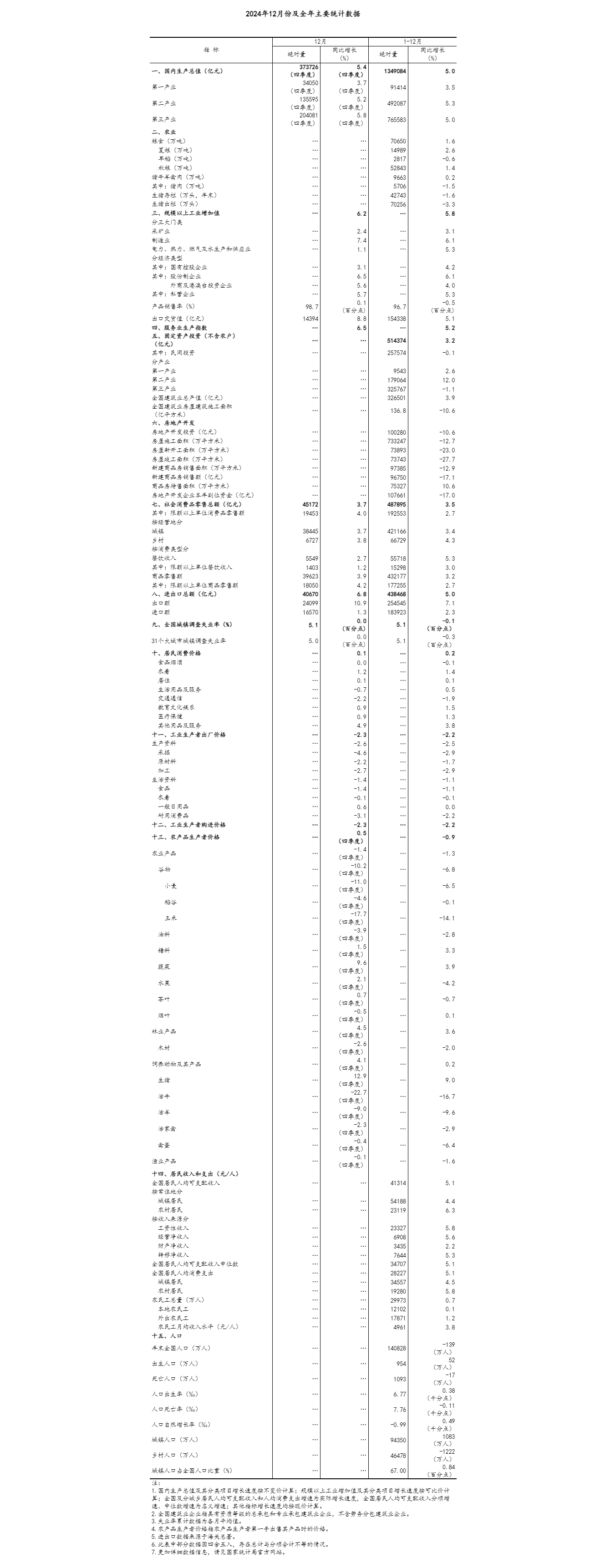 (2)根据季节调整模型自动修正结果,对近一年来各期国内生产总值、规模以上工业增加值、固定资产投资(不含农户)、社会消费品零售总额环比增速进行修订。修订结果及2024年四季度GDP环比数据、2024年12月份其他指标环比数据如下: