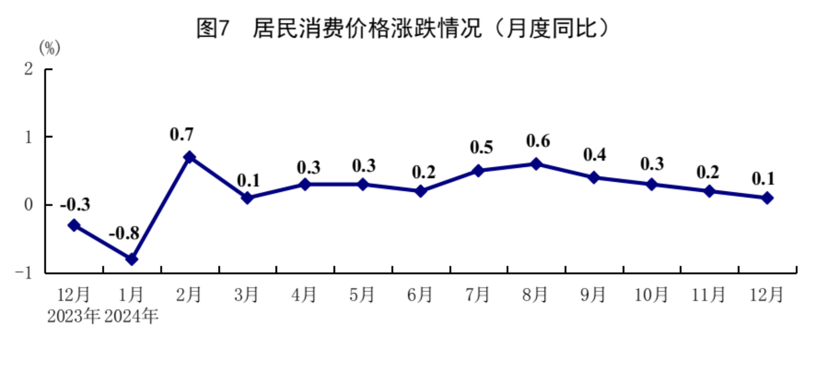 全年居民消费价格(CPI)比上年上涨0.2%。分类别看,食品烟酒价格下降0.1%,衣着价格上涨1.4%,居住价格上涨0.1%,生活用品及服务价格上涨0.5%,交通通信价格下降1.9%,教育文化娱乐价格上涨1.5%,医疗保健价格上涨1.3%,其他用品及服务价格上涨3.8%。在食品烟酒价格中,鲜果价格下降3.5%,粮食价格下降0.1%,鲜菜价格上涨5.0%,猪肉价格上涨7.7%。扣除食品和能源价格后的核心CPI上涨0.5%。12月份,居民消费价格同比上涨0.1%,环比持平。全年工业生产者出厂价格和购进价格比上年均下降2.2%;12月份,工业生产者出厂价格和购进价格同比均下降2.3%,环比均下降0.1%。