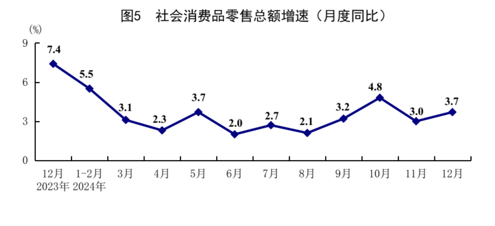 全年社会消费品零售总额487895亿元,比上年增长3.5%。按经营单位所在地分,城镇消费品零售额421166亿元,增长3.4%;乡村消费品零售额66729亿元,增长4.3%。按消费类型分,商品零售额432177亿元,增长3.2%;餐饮收入55718亿元,增长5.3%。基本生活类和部分升级类商品销售增势较好,全年限额以上单位家用电器和音像器材类、体育娱乐用品类、通讯器材类、粮油食品类商品零售额分别增长12.3%、11.1%、9.9%、9.9%。全国网上零售额155225亿元,比上年增长7.2%。其中,实物商品网上零售额130816亿元,增长6.5%,占社会消费品零售总额的比重为26.8%。四季度,社会消费品零售总额同比增长3.8%。12月份,社会消费品零售总额同比增长3.7%,环比增长0.12%。全年服务零售额比上年增长6.2%。