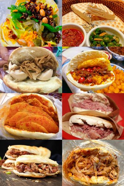 花干鸡蛋夹馍、八宝辣子夹馍、油泼辣子夹馍……