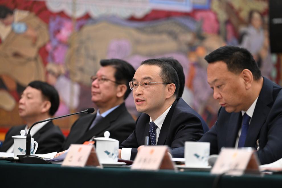 3月6日上午,出席十四届全国人大三次会议的西藏代表团举行开放团组活动。图为全国人大代表、西藏自治区日喀则市市长王方红在回答记者提问。(西藏代表团供图)