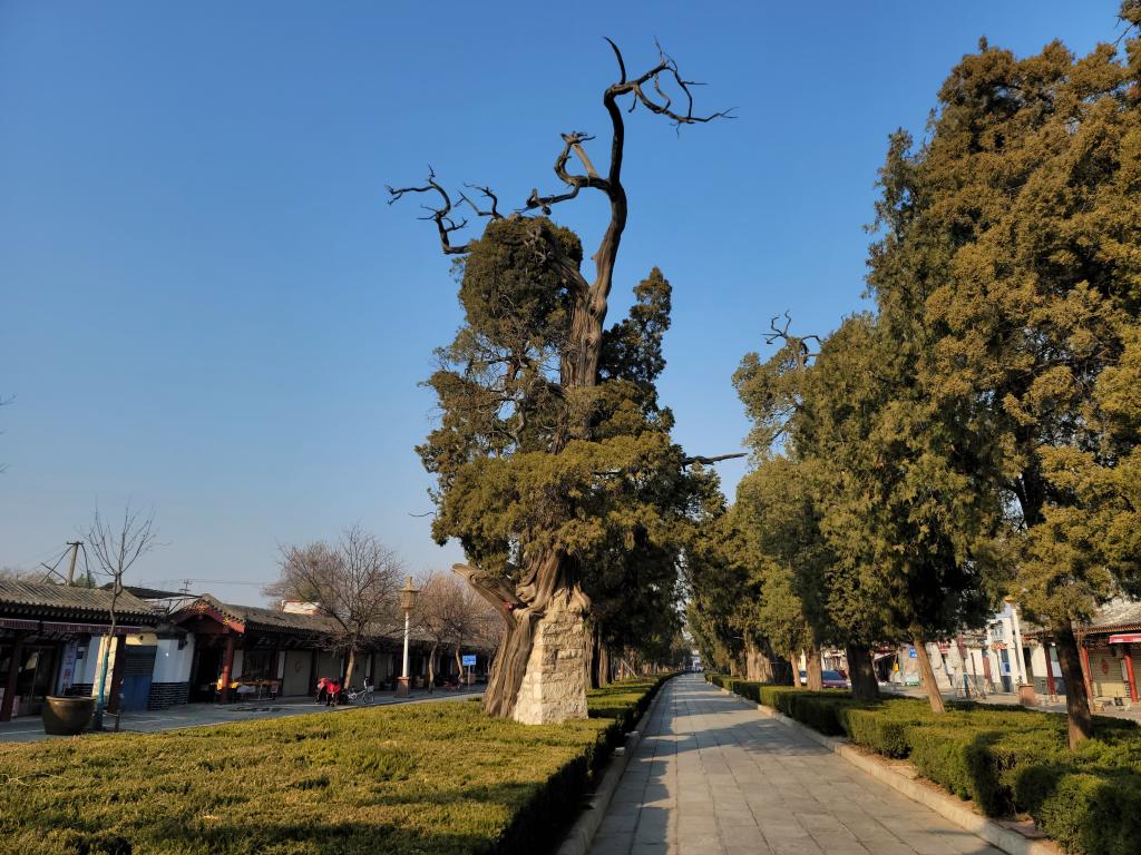 作为三孔景区的特色旅游资源,古树名木吸引了不少游客慕名而来,景区内的一些古树因此变身“网红树”。在孔林门口的神道上,一棵奇特的树成为一道风景,引得游客争相合影。虬劲的树根倚靠石柱,交缠盘错,浑然一体。