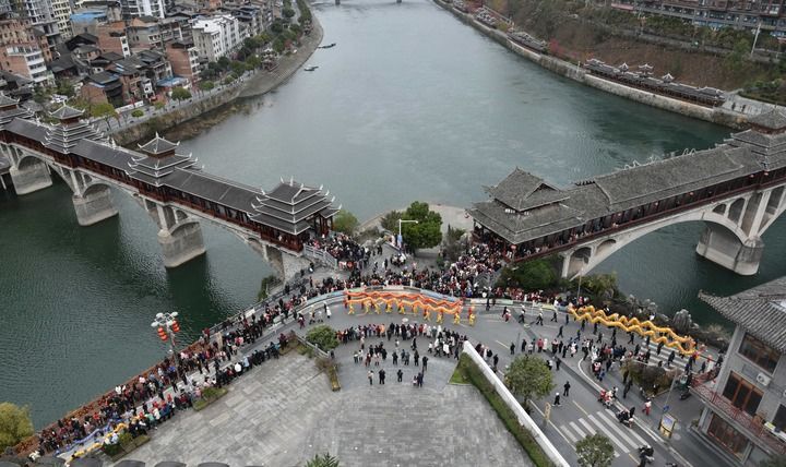 2024年2月22日,在贵州省黔东南苗族侗族自治州锦屏县,舞龙队经过两座风雨桥的交汇处。风雨桥,又称“花桥”,是侗族的标志性建筑之一。因桥上建有廊和亭,既可行人又可遮蔽风雨,故称风雨桥。其以木为料、以榫衔接,是侗族桥梁建筑艺术的结晶。鼓楼、花桥的侗族木构建筑营造技艺被列入国家级非物质文化遗产代表性项目。