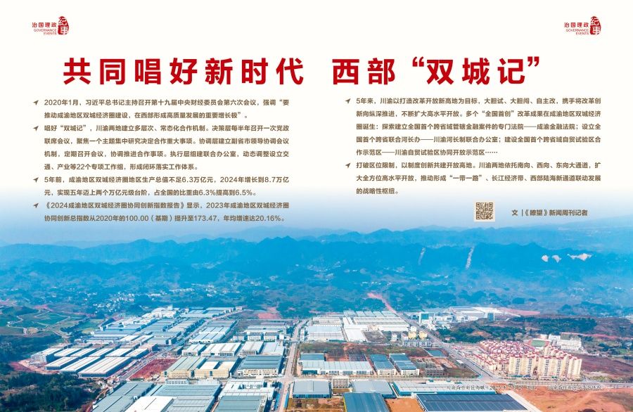 ◇5年来,川渝以打造改革开放新高地为目标,大胆试、大胆闯、自主改,携手将改革创新向纵深推进,不断扩大高水平开放。多个“全国首创”改革成果在成渝地区双城经济圈诞生:探索建立全国首个跨省域管辖金融案件的专门法院——成渝金融法院;设立全国首个跨省联合河长办——川渝河长制联合办公室;建设全国首个跨省域自贸试验区合作示范区——川渝自贸试验区协同开放示范区……