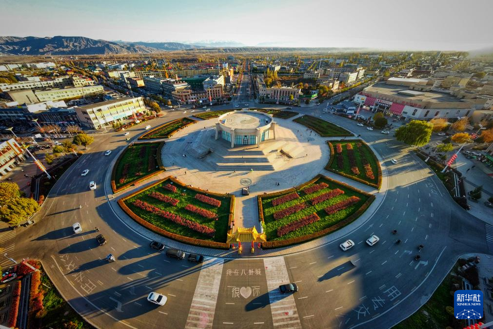 这是新疆伊犁哈萨克自治州特克斯县八卦城中心——太极坛(2023年11月4日摄,无人机照片)。新华社发(赵丰收 摄)