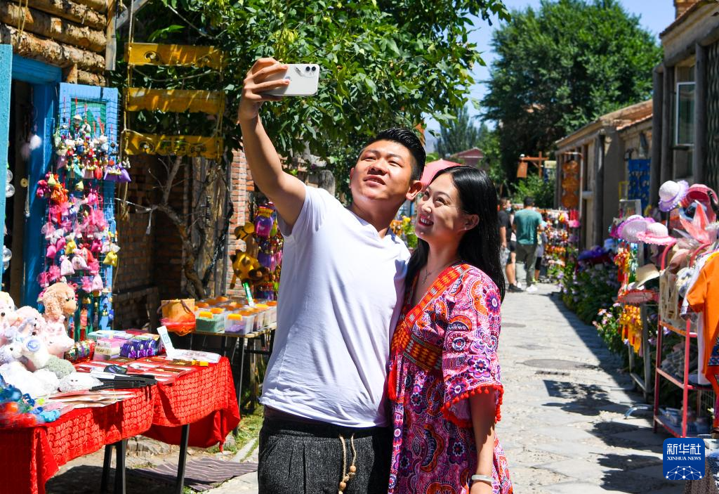 在新疆伊犁哈萨克自治州特克斯县,游客在离街打卡拍照(2021年7月23日摄)。新华社发(汤永 摄)