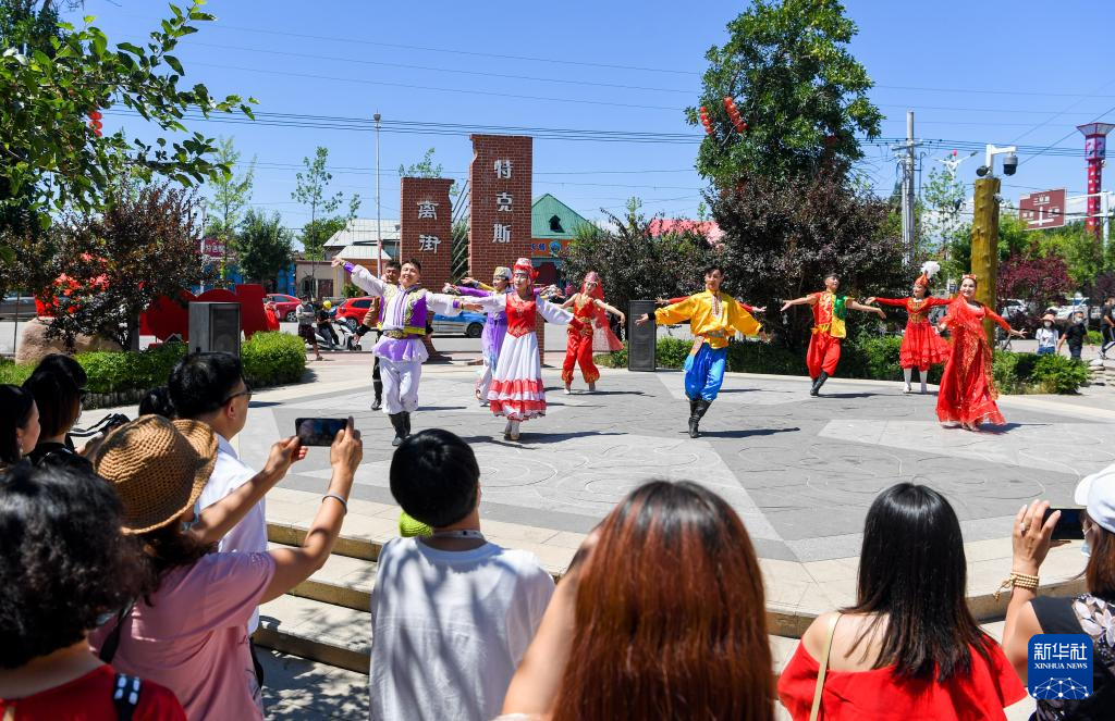 在新疆伊犁哈萨克自治州特克斯县,游客在离街欣赏文艺表演(2021年7月23日摄)。新华社发(汤永 摄)