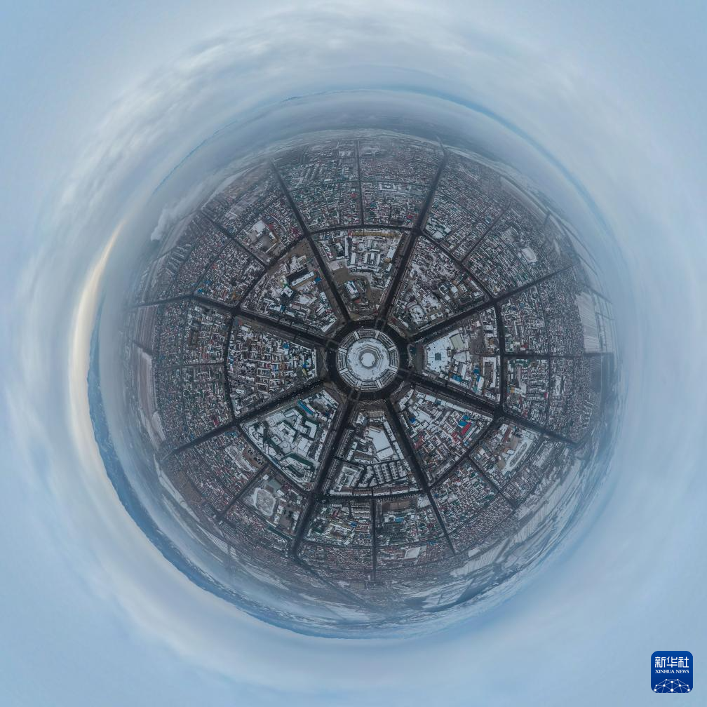 这是新疆伊犁哈萨克自治州特克斯县八卦城冬季景色(2021年1月2日摄,无人机球形全景照片)。新华社记者 丁磊 摄