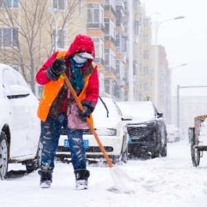 2025年4月12日,在黑龙江省大兴安岭地区,环卫工人在清理积雪。当日,我国北方多地出现大风降温天气。新华社记者 程泓淳 摄