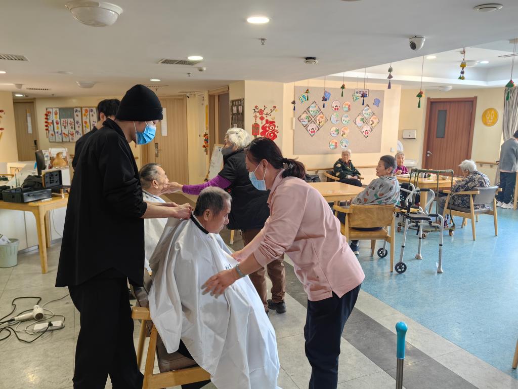 在沈阳市怡园长者照料中心,工作人员正在为老人理发。 新华社记者白涌泉 摄