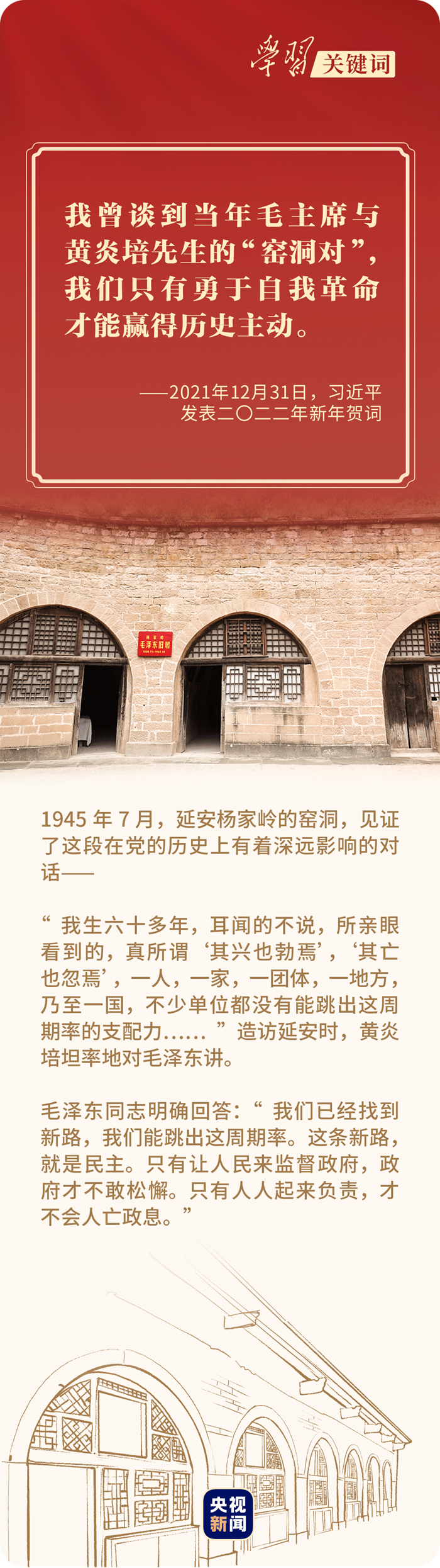2021年11月11日,在党的十九届六中全会上,习近平总书记给出新解:“毛泽东同志在延安的窑洞里给出了第一个答案,这就是“只有让人民来监督政府,政府才不敢松懈”。经过百年奋斗特别是党的十八大以来新的实践,我们党又给出了第二个答案,这就是自我革命。”