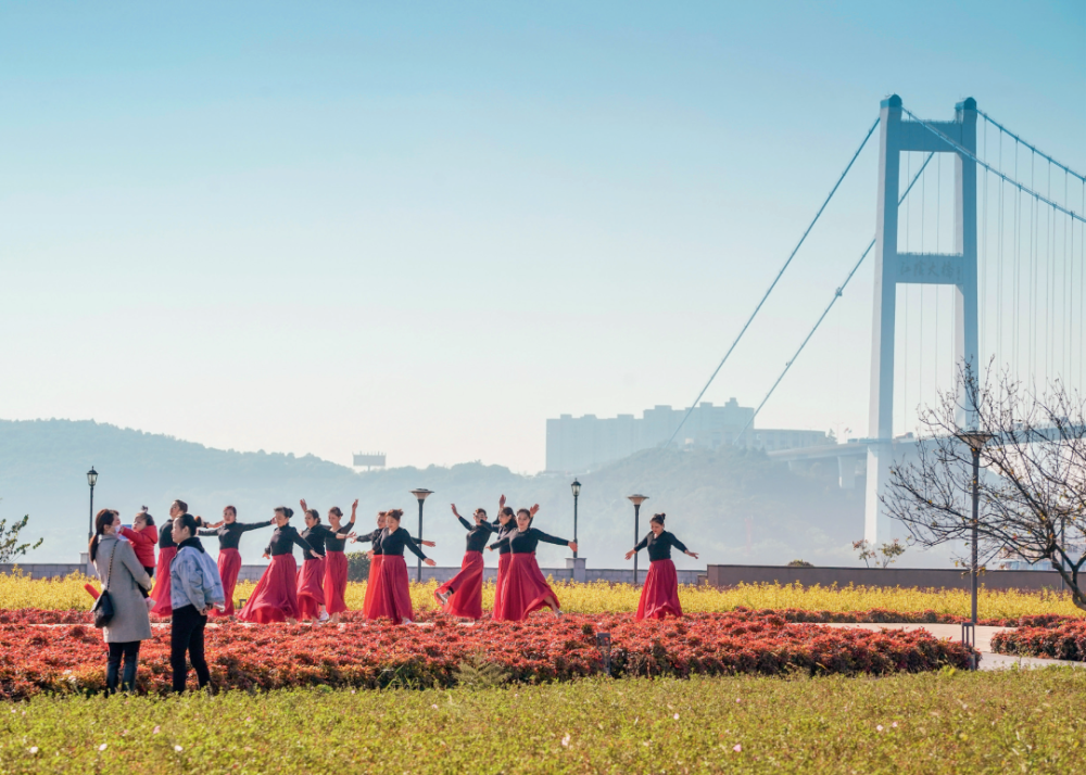 市民在位于江阴长江大桥北岸的音乐花海公园排练广场舞(2021年11月12日摄)。 杨磊摄