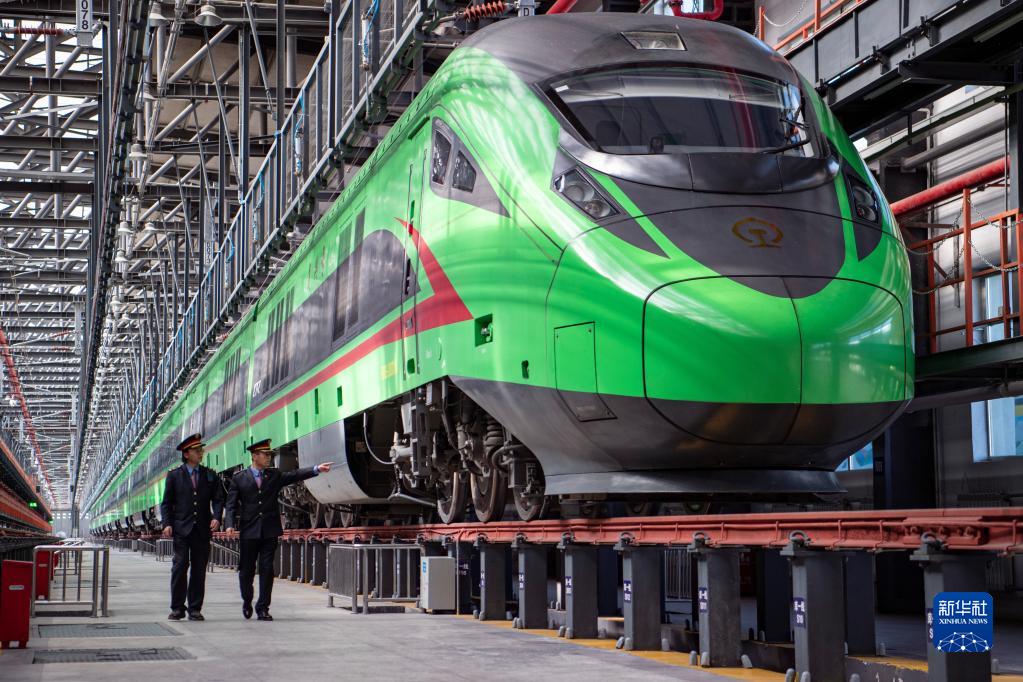 在拉萨机辆整备中心,黄起岗(右)和同事交流动车组驾驶经验和业务知识(2023年1月11日摄)。新华社记者 孙非 摄