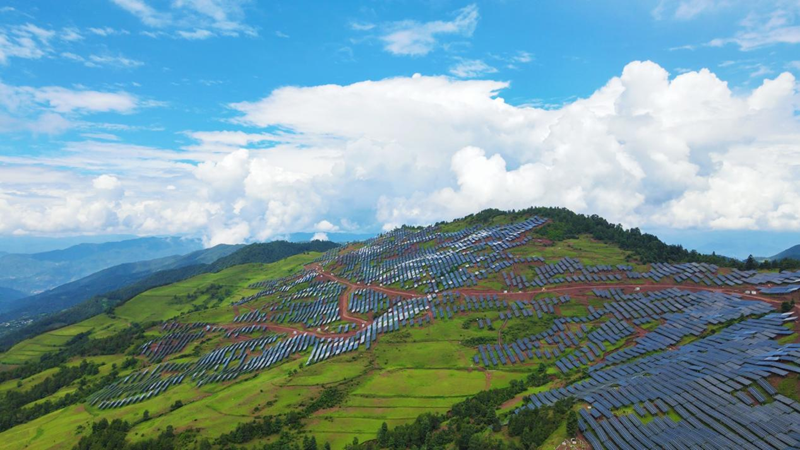 从华能苗尾·功果桥电厂所在的云南省大理州云龙县东行102公里,就来到了电厂2024年负责建设管理的17个光伏电站之一——小甲地光伏电站。电站地处太阳能资源丰富的大理州永平县,举目四望,连绵起伏的山脉上,排列整齐的光伏板向阳而立,如同一片波澜起伏的蓝色“海洋”,让周边的“光”景焕然一“新”。