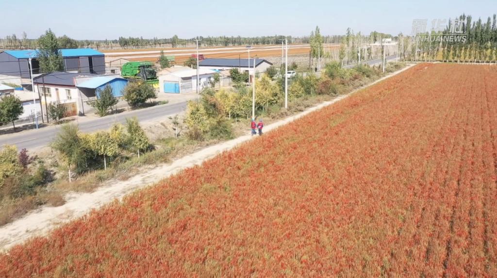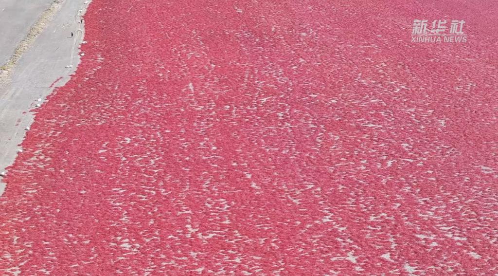 眼下,新疆沙湾市的5万余亩辣椒开始陆续成熟,进入采收季节。在沙湾市安集海镇万亩天然晒场上,红彤彤的辣椒正享受着“日光浴”,从空中俯瞰宛如红色的海洋。