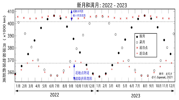 “超级月亮”是近地点附近的满月,年度“最大满月”也是近地点附近的满月,看起来说的似乎是一回事。那么,“超级月亮”是不是就完全和年度“最大满月”划等号了呢?我们用一张图表来说明。