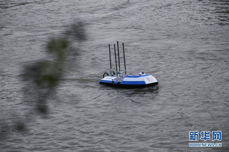 资料图片:工作人员操作的智能无人监测船在对河道进行水质快速监测分析