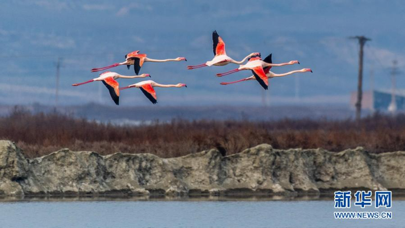 资料图片:盐湖景区内,火烈鸟展翅飞翔