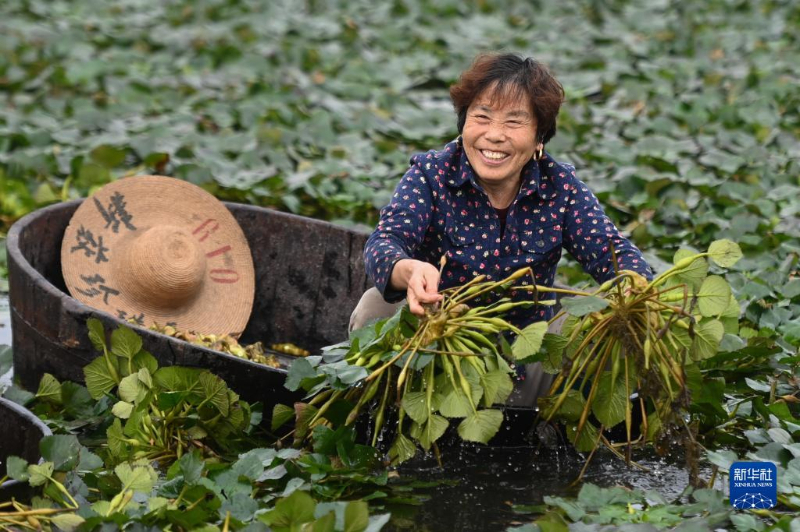 在南浔区和孚镇新荻村菱塘,村民划着菱桶采摘菱角