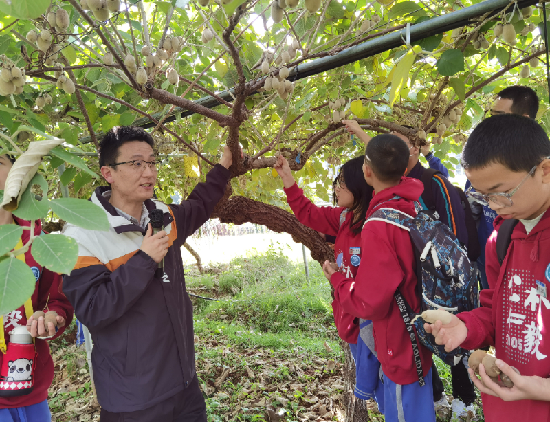 在基地参观学习环节,4名科普导师对基地内桃、梨、柑橘、猕猴桃等果树品种及科普基地各区块功能进行了相关介绍,重点对果树树种特点及其涉及的科技前沿知识进行了科普讲解,通过互动与问答形式传递果树与生物学科关联的科普实践知识。