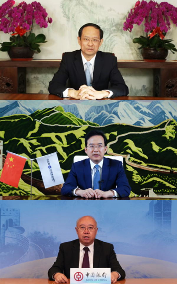 中国工商银行副行长王景武(上),中国建设银行副行长王兵(中),中国银行风险总监刘坚东(下)视频发言
