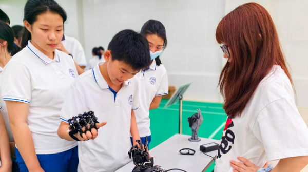 在仿生机械手体验区,同学们好奇的看着仿生机械手模仿着人手动作,手指灵活地来回运动,感受着生物仿生学与机械工程交融的科技之美。初一年级二班的王梓羿在体验后分享了他的感受“我印象最深刻的项目是仿生机械手,当我们穿戴上设备,仿生机械手可以随着我们的手指一起运动,我认为是编程在背后起作用,这是一个非常精彩的体验项目”。