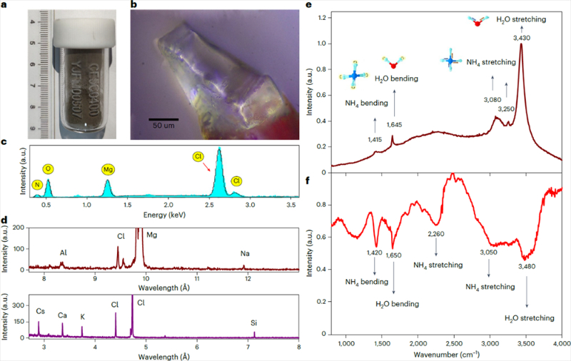 但此次月壤中发现的水可不一般!在嫦娥五号携带回的迄今为止纬度最高的月壤样本中,研究人员发现的是一种未知的矿物晶体——六水氯化镁铵(ULM-1)。基于单晶衍射和化学分析,研究人员发现这种矿物成分为(NH4,K,Cs,Rb)MgCl3·6H2O的水合物形式,其中含有大量的水分子和铵。尽管发现的并不是直接的液态水或冰,但该矿物中水分子的质量比高达41%——1吨矿物中约有410千克水分子,在加热条件下还能以水蒸气的形式逸出。