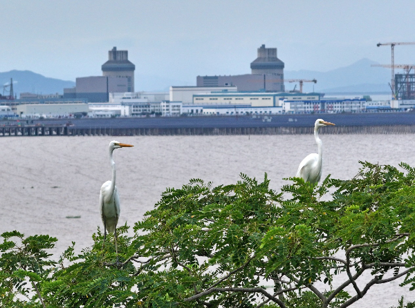 两只白鹭与三门核电机组相伴,它们的到来为工业风增添了些许灵动 侯邦军摄